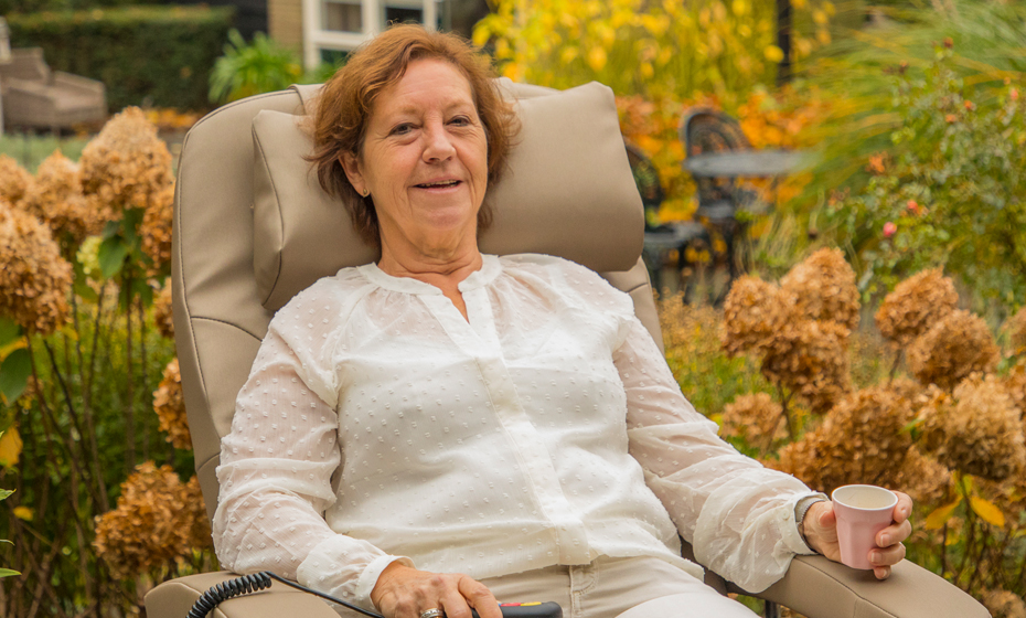 Ontspanning en meer energieEr is ook aandacht voor het zitten van de gasten. “Als iemand even uit bed kan, hoe zet je hem of haar dan op een stoel? En waar moet die stoel aan voldoen?” Vanuit haar lange ervaring met mensen met allerlei aandoeningen, weet ze dat comfortabel zitten voor ontspanning zorgt. “Daarmee kun je onder andere doorzitplekken voorkomen. Bovendien zorgt ontspanning voor meer energie en een hogere belastbaarheid.” Bij goed zitten hoort ook goed opstaan, gaat Josien verder. “Ik ben in mijn werk bij veel cliënten thuisgekomen. Je ziet mensen dan vaak scheef en onderuitgezakt op een bank zitten. Ik begon meestal met het leggen van een paar boeken onder de voorpoten. Dat zorgt direct voor een andere, meer ontspannen zithouding. Je moet het voelen, daar begint het mee. De volgende stap kan, indien nodig, een verstelbare stoel met sta-op functie zijn.” Positief over FitformMet de Fitform-zorgfauteuil heeft Josien Boomgaard uitsluitend positieve ervaringen. “Wat ik mooi vind, is dat het een stoel is die er niet ‘gehandicapt’ uitziet, maar wel volop aanpasbaar is aan de behoeften en noodzaak van de klant. Ik weet nog dat ik een keer aangaf dat een mevrouw een stoel nodig had met niet alleen een ROHO-kussen op de zitting, maar ook op de rug. Iedereen zei dat dit niet kon, maar Fitform heeft het gemaakt. Die mevrouw was innig gelukkig, want het was voor haar de enige mogelijkheid om fatsoenlijk te kunnen zitten.” Foto's: Astrid Bron Zorgfotograaf | ![]() |