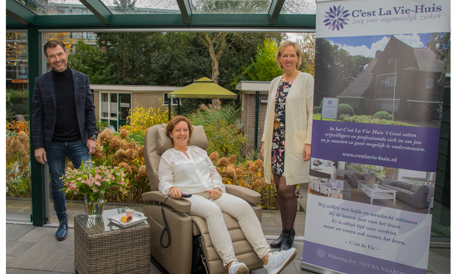 Het C’est la Vie-Huis in Naarden kreeg op dinsdag 17 november een mooie zorgfauteuil cadeau. In het jubileumjaar van Fitform was dit de derde ‘schenkstoel’ die we met plezier hebben overhandigd. Het hospice werd voorgedragen door Josien Boomgaard, die met haar ergotherapeutische achtergrond van grote waarde is voor de vrijwilligers en gasten van het hospice. Coördinator Marina Bol van het C’est la Vie-Huis nam de nieuwe fauteuil in ontvangst. Het hospice ontvangt sinds maart 2017 gasten. Vanaf het begin is Josien Boomgaard (70), woonachtig in Naarden, als vrijwilliger betrokken. “Eerst voor de inrichting en noodzakelijke hulpmiddelen en daarna als ergotherapeut. Ik train alle vrijwilligers om zo veilig mogelijk te kunnen functioneren.” Het C’est la Vie-Huis telt acht kamers waarin de gasten hun laatste maanden, weken, dagen of uren doorbrengen. Met liefdevolle aandacht van de vrijwilligers en een professional. | ![]() |